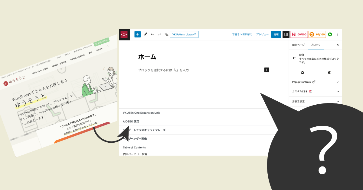 対応が難しい場合はゆーそうとに別途作業をご依頼して固定ページを書き換えられるようになります